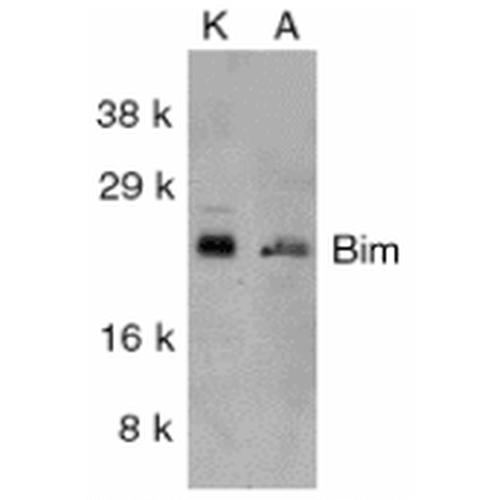 Members in the Bcl-2 family are critical regulators of apoptosis by either inhibiting or promoting cell death. Bim/BOD is a group of three splice variants, BimEL, BimL and BimS, with apparent molecular masses of ~23, 16, and 13 kDa, respectively. Bcl-2 homology 3 (BH3) domain is a potent death domain. BH3 domain containing pro-apoptotic proteins, including Bad, Bax, Bid, Bik, and Hrk, form a growing subclass of the Bcl-2 family. A novel BH3 domain containing protein was recently identified and designated Bim or BOD in human, mouse and rat (1,2). Bim/BOD interacts with diverse members in the pro-survival Bcl-2 sub-family including Bcl-2, Bcl-xL and Bcl-w. Bim/BOD induces apoptosis. The messenger RNA of Bim is ubiquitously expressed in multiple tissues and cell lines (1 ,2).