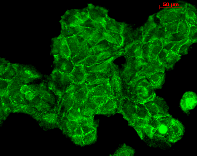Immunocytochemistry/Immunofluorescence analysis using Rabbit Anti-RAS Polyclonal Antibody (SPC-173). Tissue: HeLa Cells. Species: Human. Fixation: 2% Formaldehyde for 20 min at RT. Primary Antibody: Rabbit Anti-RAS Polyclonal Antibody (SPC-173) at 1:200 for 12 hours at 4°C. Secondary Antibody: APC Goat Anti-Rabbit (red) at 1:200 for 2 hours at RT. Counterstain: DAPI (blue) nuclear stain at 1:40000 for 2 hours at RT. Localization: Cell membrane. Lipid-anchor. Focal adhesion. Magnification: 100x. (A) DAPI (blue) nuclear stain. (B) Anti-RAS Antibody. (C) Composite. | Immunohistochemistry analysis using Rabbit Anti-RAS Polyclonal Antibody (SPC-173). Tissue: backskin. Species: Mouse. Fixation: Bouin's Fixative Solution. Primary Antibody: Rabbit Anti-RAS Polyclonal Antibody (SPC-173) at 1:100 for 1 hour at RT. Secondary Antibody: FITC Goat Anti-Rabbit (green) at 1:50 for 1 hour at RT. Localization: Basal cell of the epidermis. | Western blot analysis of Mouse Brain Cortex cell lysates showing detection of ~21 kDa RAS protein using Rabbit Anti-RAS Polyclonal Antibody (SPC-173). Lane 1: Molecular Weight Ladder (MW). Lane 2: Mouse Brain Cortex cell lysates. Load: 30 µg. Block: 5% Skim Milk in 1X TBST. Primary Antibody: Rabbit Anti-RAS Polyclonal Antibody (SPC-173) at 1:1000 for 2 hours at RT. Secondary Antibody: Goat Anti-Rabbit IgG: HRP at 1:2000 for 60 min at RT. Color Development: ECL solution for 5 min at RT. Predicted/Observed Size: ~21 kDa. | Immunocytochemistry/Immunofluorescence analysis using Rabbit Anti-RAS Polyclonal Antibody (SPC-173). Tissue: HaCaT cells. Species: Human. Fixation: Cold 100% methanol at -20C for 10 minutes. Primary Antibody: Rabbit Anti-RAS Polyclonal Antibody (SPC-173) at 1:100 for 12 hours at 4°C. Secondary Antibody: FITC Goat Anti-Rabbit at 1:50 for 1-2 hours at RT in dark. Localization: Cell-cell junction. | Immunocytochemistry/Immunofluorescence analysis using Rabbit Anti-RAS Polyclonal Antibody (SPC-173). Tissue: HeLa Cells. Species: Human. Fixation: 2% Formaldehyde for 20 min at RT. Primary Antibody: Rabbit Anti-RAS Polyclonal Antibody (SPC-173) at 1:200 for 12 hours at 4°C. Secondary Antibody: FITC Goat Anti-Rabbit (green) at 1:200 for 2 hours at RT. Counterstain: DAPI (blue) nuclear stain at 1:40000 for 2 hours at RT. Localization: Cell membrane. Lipid-anchor. Focal adhesion. Magnification: 20x. (A) DAPI (blue) nuclear stain. (B) Anti-RAS Antibody. (C) Composite. Rabbit Anti-RAS Antibody used in Immunocytochemistry/Immunofluorescence (ICC/IF) on Human HeLa Cells (SPC-173) | Rabbit Anti-RAS Antibody used in Immunohistochemistry (IHC) on Mouse backskin (SPC-173) | Rabbit Anti-RAS Antibody used in Western blot (WB) on Brain Cortex cell lysates (SPC-173) | Rabbit Anti-RAS Antibody used in Immunocytochemistry/Immunofluorescence (ICC/IF) on Human HaCaT cells (SPC-173) | Rabbit Anti-RAS Antibody used in Immunocytochemistry/Immunofluorescence (ICC/IF) on Human HeLa Cells (SPC-173)