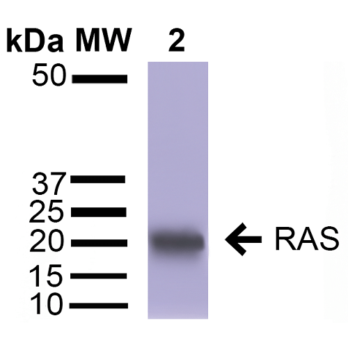Synthetic peptide corresponding to amino acids 31-43 of human RAS. (The immunogen peptide is from the effector binding loop (l2) of the H, K and N-Ras (AA31-43). This sequence is identical yeast, slime mould, fungi, Xenopus, rat, mouse and chicken over these residues.)