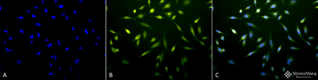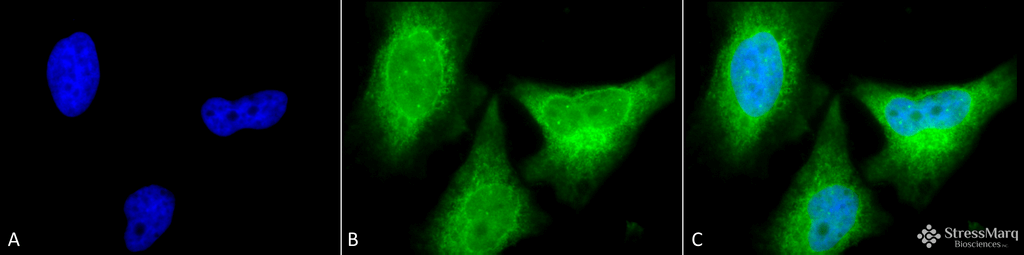 Immunocytochemistry/Immunofluorescence analysis using Rabbit Anti-Cytochrome P450 Reductase Polyclonal Antibody (SPC-210). Tissue: Heat Shocked HeLa Cells. Species: Human. Fixation: 2% Formaldehyde for 20 min at RT. Primary Antibody: Rabbit Anti-Cytochrome P450 Reductase Polyclonal Antibody (SPC-210) at 1:60 for 12 hours at 4°C. Secondary Antibody: FITC Goat Anti-Rabbit (green) at 1:200 for 2 hours at RT. Counterstain: DAPI (blue) nuclear stain at 1:40000 for 2 hours at RT. Localization: Endoplasmic reticulum membrane. Cytosol. Magnification: 20x. (A) DAPI (blue) nuclear stain. (B) Anti-Cytochrome P450 Reductase Antibody. (C) Composite. Heat Shocked at 42°C for 1h. | Immunocytochemistry/Immunofluorescence analysis using Rabbit Anti-Cytochrome P450 Reductase Polyclonal Antibody (SPC-210). Tissue: HeLa Cells. Species: Human. Fixation: 2% Formaldehyde for 20 min at RT. Primary Antibody: Rabbit Anti-Cytochrome P450 Reductase Polyclonal Antibody (SPC-210) at 1:150 for 12 hours at 4°C. Secondary Antibody: R-PE Goat Anti-Rabbit (yellow) at 1:200 for 2 hours at RT. Counterstain: DAPI (blue) nuclear stain at 1:40000 for 2 hours at RT. Localization: Endoplasmic reticulum membrane. Cytosol. Magnification: 100x. (A) DAPI (blue) nuclear stain. (B) Anti-Cytochrome P450 Reductase Antibody. (C) Composite. | Western blot analysis of Human, Mouse, Rat Human, Mouse and Rat Lysates showing detection of ~ 75 kDa Cytochrome P450 Reductase protein using Rabbit Anti-Cytochrome P450 Reductase Polyclonal Antibody (SPC-210). Lane 1: MW ladder. Lane 2: Human lysate, A431. Lane 3: Mouse lung lysate. Lane 4: Rat lysate, Rat Brain Membrane (RBM). Load: 20 µg. Block: 5% milk + TBST for 1 hour at RT. Primary Antibody: Rabbit Anti-Cytochrome P450 Reductase Polyclonal Antibody (SPC-210) at 1:1000 for 1 hour at RT. Secondary Antibody: Goat Anti-Rabbit HRP antibody at 1:2000 for 1 hour at RT. Color Development: TMB solution for 11 min at RT. Predicted/Observed Size: ~ 75 kDa. Other Band(s): ~30 -250 in Rat lysate only. Rabbit Anti-Cytochrome P450 Reductase Antibody used in Immunocytochemistry/Immunofluorescence (ICC/IF) on Human Heat Shocked HeLa Cells (SPC-210) | Rabbit Anti-Cytochrome P450 Reductase Antibody used in Immunocytochemistry/Immunofluorescence (ICC/IF) on Human HeLa Cells (SPC-210) | Rabbit Anti-Cytochrome P450 Reductase Antibody used in Western blot (WB) on Human, Mouse, Rat Human, Mouse and Rat Lysates (SPC-210)