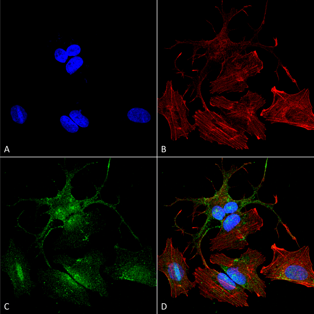 Immunocytochemistry/Immunofluorescence analysis using Rabbit Anti-Beclin 2 Polyclonal Antibody (SPC-603). Tissue: SK-N-BE Cells (Human Neuroblastoma cells). Species: Human. Fixation: 4% Formaldehyde for 15 min at RT. Primary Antibody: Rabbit Anti-Beclin 2 Polyclonal Antibody (SPC-603) at 1:100 for 60 min at RT. Secondary Antibody: Goat Anti-Mouse ATTO 488 at 1:200 for 60 min at RT. Counterstain: Phalloidin Texas Red F-Actin stain; DAPI (blue) nuclear stain at 1:1000, 1:5000 for 60 min at RT, 5 min at RT. Localization: Cytoplasm. Magnification: 60X. (A) DAPI (blue) nuclear stain (B) Phalloidin Texas Red F-Actin stain (C) Beclin 2 Antibody (D) Composite. | Western blot analysis of Rat Liver cell lysates showing detection of 48.1 kDa Beclin 2 protein using Rabbit Anti-Beclin 2 Polyclonal Antibody (SPC-603). Lane 1: Molecular Weight Ladder (MW). Lane 2: Rat Liver cell lysates. Load: 15 µg . Block: 5% Skim Milk in 1X TBST. Primary Antibody: Rabbit Anti-Beclin 2 Polyclonal Antibody (SPC-603) at 1:1000 for 1 hour at RT. Secondary Antibody: Goat Anti-Rabbit HRP at 1:2000 for 60 min at RT. Color Development: ECL solution for 6 min in RT. Predicted/Observed Size: 48.1 kDa. Rabbit Anti-Beclin 2 Antibody used in Immunocytochemistry/Immunofluorescence (ICC/IF) on Human SK-N-BE Cells (Human Neuroblastoma cells) (SPC-603) | Rabbit Anti-Beclin 2 Antibody used in Western blot (WB) on Liver cell lysates (SPC-603)