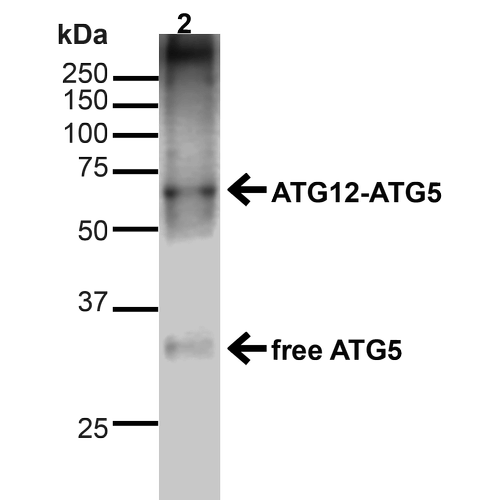 ATG5 is required for autophagy. It conjugates to ATG12 and associates with isolation membrane to form autophagosomes. The conjugate detaches from the membrane immediately before or after autophagosome formation is completed (1). Conjugation to ATG12 is essential for autophagy, but is not required for association with isolation membrane. ATG5 also plays an important role in the apoptotic process. Its expression is a relatively late event in the apoptotic process, occurring downstream of caspase activity. ATG5 is activated by ATG7 and forms a complex with ATG12 and ATG16L1. This complex is necessary for LC3-1 conjugation to PE to form LC3-II (2).