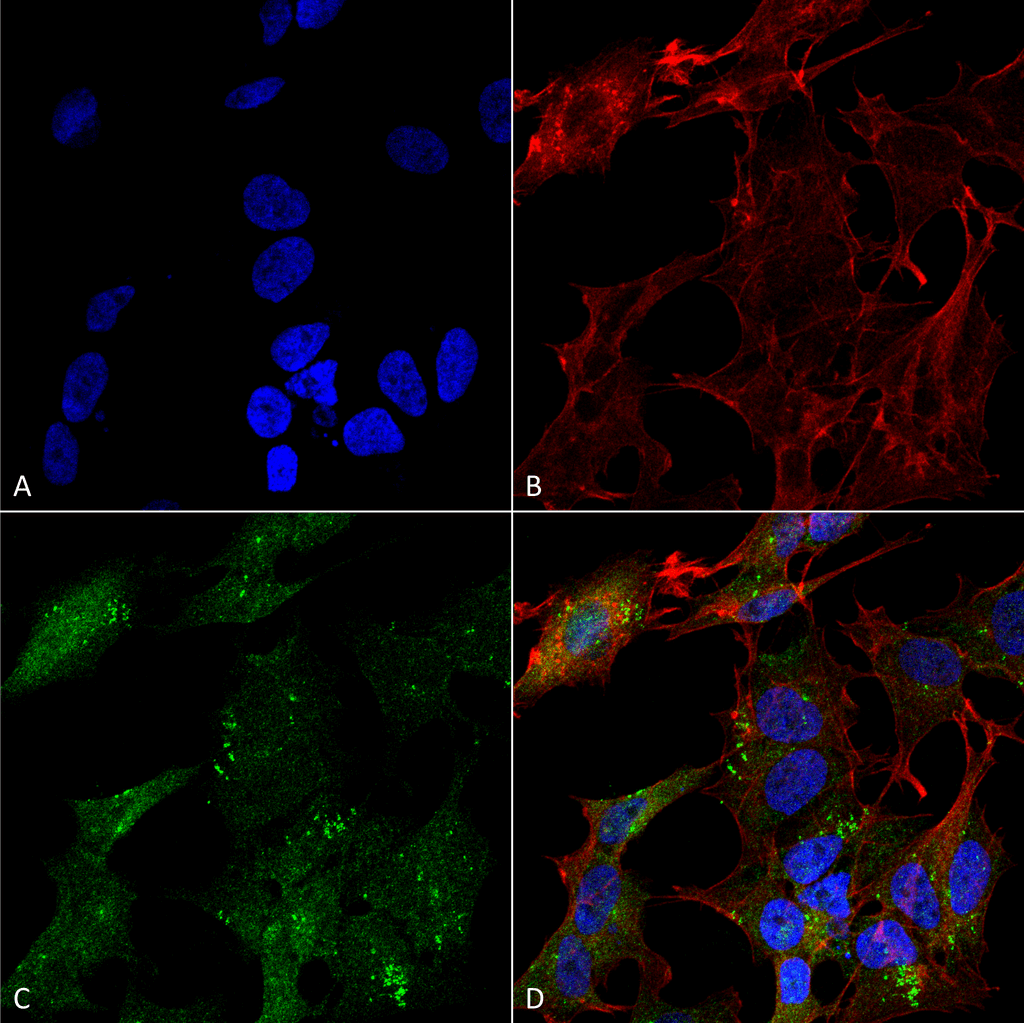 Immunocytochemistry/Immunofluorescence analysis using Rabbit Anti-ATG4B Polyclonal Antibody (SPC-631). Tissue: SK-N-BE Cells (Human Neuroblastoma cells). Species: Human. Fixation: 4% Formaldehyde for 15 min at RT. Primary Antibody: Rabbit Anti-ATG4B Polyclonal Antibody (SPC-631) at 1:100 for 60 min at RT. Secondary Antibody: Goat Anti-Mouse ATTO 488 at 1:200 for 60 min at RT. Counterstain: Phalloidin Texas Red F-Actin stain; DAPI (blue) nuclear stain at 1:1000, 1:5000 for 60 min at RT, 5 min at RT. Localization: Cytoplasm. Magnification: 60X. (A) DAPI (blue) nuclear stain (B) Phalloidin Texas Red F-Actin stain (C) ATG4B Antibody (D) Composite. | Western blot analysis of Mouse Brain cell lysates showing detection of 44.3 kDa ATG4B protein using Rabbit Anti-ATG4B Polyclonal Antibody (SPC-631). Lane 1: Molecular Weight Ladder (MW). Lane 2: Mouse Brain cell lysates. Load: 15 µg . Block: 5% Skim Milk in 1X TBST. Primary Antibody: Rabbit Anti-ATG4B Polyclonal Antibody (SPC-631) at 1:1000 for 1 hour at RT. Secondary Antibody: Goat Anti-Rabbit HRP at 1:2000 for 60 min at RT. Color Development: ECL solution for 6 min in RT. Predicted/Observed Size: 44.3 kDa. Rabbit Anti-ATG4B Antibody used in Immunocytochemistry/Immunofluorescence (ICC/IF) on Human SK-N-BE Cells (Human Neuroblastoma cells) (SPC-631) | Rabbit Anti-ATG4B Antibody used in Western blot (WB) on Brain cell lysates (SPC-631)