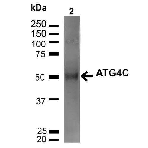 A 1:1000 dilution of SPC-632 was sufficient for detection of ATG4C on HeLa cell lysates using Goat anti-rabbit IgG:HRP as the secondary antibody.