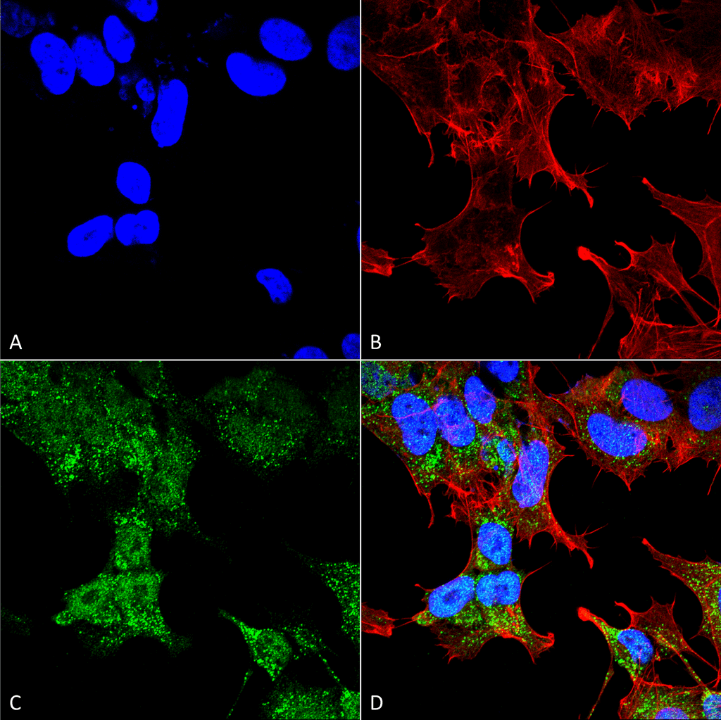 Immunocytochemistry/Immunofluorescence analysis using Rabbit Anti-FIP200 Polyclonal Antibody (SPC-658). Tissue: SK-N-BE Cells (Human Neuroblastoma cells). Species: Human. Fixation: 4% Formaldehyde for 15 min at RT. Primary Antibody: Rabbit Anti-FIP200 Polyclonal Antibody (SPC-658) at 1:100 for 60 min at RT. Secondary Antibody: Goat Anti-Mouse ATTO 488 at 1:200 for 60 min at RT. Counterstain: Phalloidin Texas Red F-Actin stain; DAPI (blue) nuclear stain at 1:1000, 1:5000 for 60 min at RT, 5 min at RT. Localization: Nucleus, Cytoplasm, Cytoplasm, Cytosol, Preautophagosomal Structure. Magnification: 60X. (A) DAPI (blue) nuclear stain (B) Phalloidin Texas Red F-Actin stain (C) FIP200 Antibody (D) Composite. | Western blot analysis of Rat Brain cell lysates showing detection of 183 kDa FIP200 protein using Rabbit Anti-FIP200 Polyclonal Antibody (SPC-658). Lane 1: Molecular Weight Ladder (MW). Lane 2: Rat Brain cell lysates. Load: 15 µg . Block: 5% Skim Milk in 1X TBST. Primary Antibody: Rabbit Anti-FIP200 Polyclonal Antibody (SPC-658) at 1:1000 for 1 hour at RT. Secondary Antibody: Goat Anti-Rabbit HRP at 1:2000 for 60 min at RT. Color Development: ECL solution for 6 min in RT. Predicted/Observed Size: 183 kDa. Rabbit Anti-FIP200 Antibody used in Immunocytochemistry/Immunofluorescence (ICC/IF) on Human SK-N-BE Cells (Human Neuroblastoma cells) (SPC-658) | Rabbit Anti-FIP200 Antibody used in Western blot (WB) on Brain cell lysates (SPC-658)