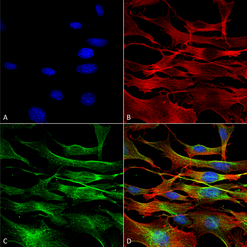 Immunocytochemistry/Immunofluorescence analysis using Rabbit Anti-alpha Tubulin Polyclonal Antibody (SPC-692). Tissue: NIH 3T3 (Mouse Fibroblast cell line). Species: Mouse. Fixation: 4% Formaldehyde for 15 min at RT. Primary Antibody: Rabbit Anti-alpha Tubulin Polyclonal Antibody (SPC-692) at 1:100 for 60 min at RT. Secondary Antibody: Goat Anti-Rabbit ATTO 488 at 1:200 for 60 min at RT. Counterstain: Phalloidin Texas Red F-Actin stain; DAPI (blue) nuclear stain at 1:1000, 1:5000 for 60 min at RT, 5 min at RT. Localization: Cytoplasm, Cytoskeleton. Magnification: 60X. (A) DAPI (blue) nuclear stain (B) Phalloidin Texas Red F-Actin stain (C) alpha Tubulin Antibody (D) Composite. | Western blot analysis of Human A549 cell lysates showing detection of 50.1 kDa alpha Tubulin Antibody protein using Rabbit Anti-alpha Tubulin Antibody Polyclonal Antibody (SPC-692). Lane 1: Molecular Weight Ladder (MW). Lane 2: Human A549 cell lysates. Load: 15 µg . Block: 2% BSA and 2% Skim Milk in 1X TBST. Primary Antibody: Rabbit Anti-alpha Tubulin Antibody Polyclonal Antibody (SPC-692) at 1:1000 for 16 hours at 4°C. Secondary Antibody: Goat Anti-Rabbit IgG: HRP at 1:2000 for 60 min at RT. Color Development: ECL solution for 6 min in RT. Predicted/Observed Size: 50.1 kDa. | Western blot analysis of Human HeLa cell lysates showing detection of 50.1 kDa alpha Tubulin Antibody protein using Rabbit Anti-alpha Tubulin Antibody Polyclonal Antibody (SPC-692). Lane 1: Molecular Weight Ladder (MW). Lane 2: Human HeLa cell lysates. Load: 15 µg . Block: 5% Skim Milk in 1X TBST. Primary Antibody: Rabbit Anti-alpha Tubulin Antibody Polyclonal Antibody (SPC-692) at 1:1000 for 16 hours at 4°C. Secondary Antibody: Goat-Anti-Rabbit IgG: HRP at 1:2000 for 60 min at RT. Color Development: TMB. Predicted/Observed Size: 50.1 kDa. Rabbit Anti-alpha Tubulin Antibody used in Immunocytochemistry/Immunofluorescence (ICC/IF) on NIH 3T3 (Mouse Fibroblast cell line) (SPC-692) | Rabbit Anti-alpha Tubulin Antibody used in Western blot (WB) on A549 cell lysates (SPC-692) | Rabbit Anti-alpha Tubulin Antibody used in Western blot (WB) on HeLa cell lysates (SPC-692)