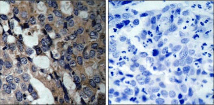 Immunohistochemistry analysis using Rabbit Anti-Hsp27 Polyclonal Antibody (SPC-1260). Tissue: Breast Carcinoma Tissue. Species: Human. Fixation: Formalin fixed paraffin-embedded. Primary Antibody: Rabbit Anti-Hsp27 Polyclonal Antibody (SPC-1260) at 1:1000. The image on the right is treated with the synthesized peptide. | Western blot analysis of Human HeLa cell lysates showing detection of ~27kDa Hsp27 protein using Rabbit Anti-Hsp27 Polyclonal Antibody (SPC-1260). Lane 1 and Lane 2: Human HeLa, Hsp27 Antibody (Ser15). Lane 3 and Lane 4: Human HeLa, Hsp27 Antibody (pSer15). Primary Antibody: Rabbit Anti-Hsp27 Polyclonal Antibody (SPC-1260) at 1:1000. Predicted/Observed Size: ~27kDa. Rabbit Anti-Hsp27 Antibody (Ser15) used in Immunohistochemistry (IHC) on Breast Carcinoma Tissue (SPC-1260) | Rabbit Anti-Hsp27 Antibody (Ser15) used in Western blot (WB) on HeLa cell lysates (SPC-1260)