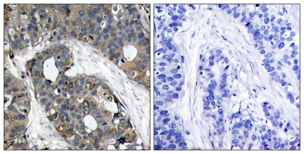Immunohistochemistry analysis using Rabbit Anti-HSP27 Polyclonal Antibody (SPC-1262). Tissue: Breast Carcinoma Tissue. Species: Human. Fixation: Formalin fixed paraffin-embedded. Primary Antibody: Rabbit Anti-HSP27 Polyclonal Antibody (SPC-1262) at 1:100. The image on the right is treated with the synthesized peptide. | Western blot analysis of Human HeLa cell lysates showing detection of ~27kDa HSP27 protein using Rabbit Anti-HSP27 Polyclonal Antibody (SPC-1262). Lane 1 and Lane 2: Human HeLa untreated or treated with Ca2+, Hsp27 Antibody (Ser82). Lane 3 and Lane 4: Human HeLa untreated or treated with Ca2+, Hsp27 Antibody (pSer82). Primary Antibody: Rabbit Anti-HSP27 Polyclonal Antibody (SPC-1262) at 1:1000. Predicted/Observed Size: ~27kDa. Rabbit Anti-HSP27 Antibody (Ser82) used in Immunohistochemistry (IHC) on Breast Carcinoma Tissue (SPC-1262) | Rabbit Anti-HSP27 Antibody (Ser82) used in Western blot (WB) on HeLa cell lysates (SPC-1262)