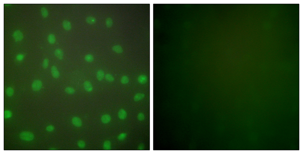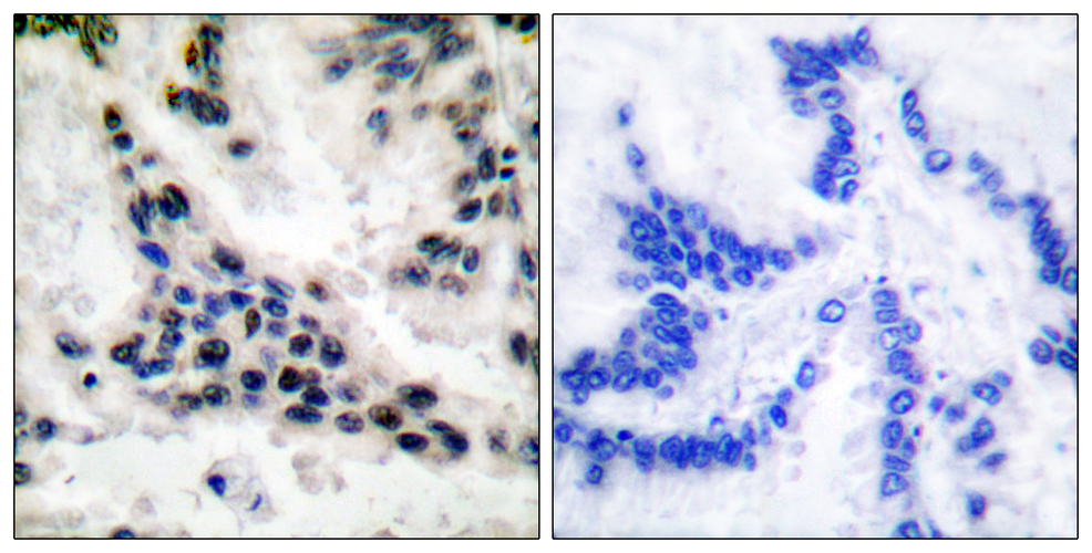 Immunohistochemistry analysis using Rabbit Anti-HDAC1 Polyclonal Antibody (SPC-1324). Tissue: Lung Carcinoma Tissue. Species: Human. Primary Antibody: Rabbit Anti-HDAC1 Polyclonal Antibody (SPC-1324) at 1:100. The image on the right is treated with the synthesized peptide. | Immunocytochemistry/Immunofluorescence analysis using Rabbit Anti-HDAC1 Polyclonal Antibody (SPC-1324). Tissue: NIH/3T3. Species: Mouse. Primary Antibody: Rabbit Anti-HDAC1 Polyclonal Antibody (SPC-1324) at 1:100. The image on the right is treated with the synthesized peptide. | Western blot analysis of Mouse NIH/3T3 cell lysates showing detection of ~62kDa HDAC1 protein using Rabbit Anti-HDAC1 Polyclonal Antibody (SPC-1324). Lane 1: Mouse NIH/3T3. Lane 2: Mouse NIH/3T3 treated with the immunizing peptide. Primary Antibody: Rabbit Anti-HDAC1 Polyclonal Antibody (SPC-1324) at 1:1000. Predicted/Observed Size: ~62kDa. Rabbit Anti-HDAC1 Antibody used in Immunohistochemistry (IHC) on Lung Carcinoma Tissue (SPC-1324) | Rabbit Anti-HDAC1 Antibody used in Immunocytochemistry/Immunofluorescence (ICC/IF) on NIH/3T3 (SPC-1324) | Rabbit Anti-HDAC1 Antibody used in Western blot (WB) on NIH/3T3 cell lysates (SPC-1324)