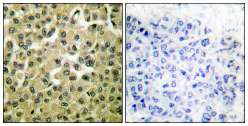 Immunohistochemistry analysis using Rabbit Anti-MCL1 Polyclonal Antibody (SPC-1328). Tissue: Breast Carcinoma Tissue. Species: Human. Fixation: Formalin fixed paraffin-embedded. Primary Antibody: Rabbit Anti-MCL1 Polyclonal Antibody (SPC-1328) at 1:100. The image on the right is treated with the synthesized peptide. | Western blot analysis of Human HuvEc cell lysates showing detection of ~40kDa MCL1 protein using Rabbit Anti-MCL1 Polyclonal Antibody (SPC-1328). Lane 1: Human HuvEc cells. Lane 2: Human HuvEc cells treated with the immunizing peptide. Primary Antibody: Rabbit Anti-MCL1 Polyclonal Antibody (SPC-1328) at 1:1000. Predicted/Observed Size: ~40kDa. Rabbit Anti-MCL1 Antibody used in Immunohistochemistry (IHC) on Breast Carcinoma Tissue (SPC-1328) | Rabbit Anti-MCL1 Antibody used in Western blot (WB) on HuvEc cell lysates (SPC-1328)